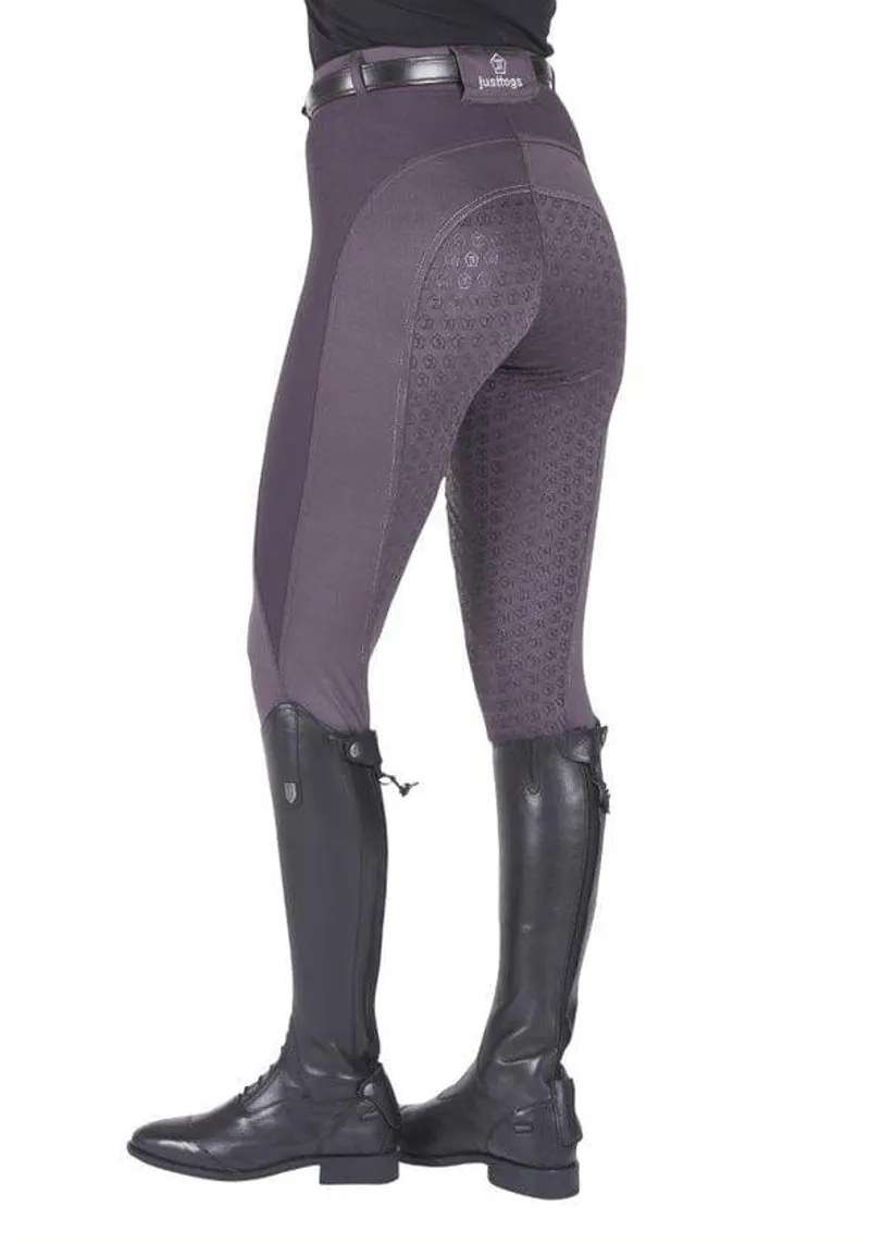 Just Tights have be designed with comfort in mind, these super sporty tights feature a full silicone gel seat which covers the knee and a deep waistband for security and comfort in the saddle. The technical fabrics are designed to fit like a second skin. The elegant silicone glitter logo down the thigh is covered by a mesh material for extra durability whilst the side panels give a flattering sculpt to the rider.