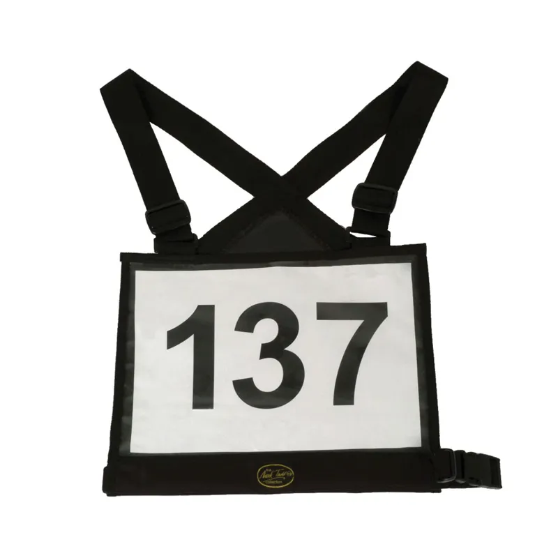 Slide number cards between canvas backing and plastic window. Holds two A4 cards – one on the front, one on the back. (Number cards are not included). Elasticated around waist for use over a body protector and air jacket.