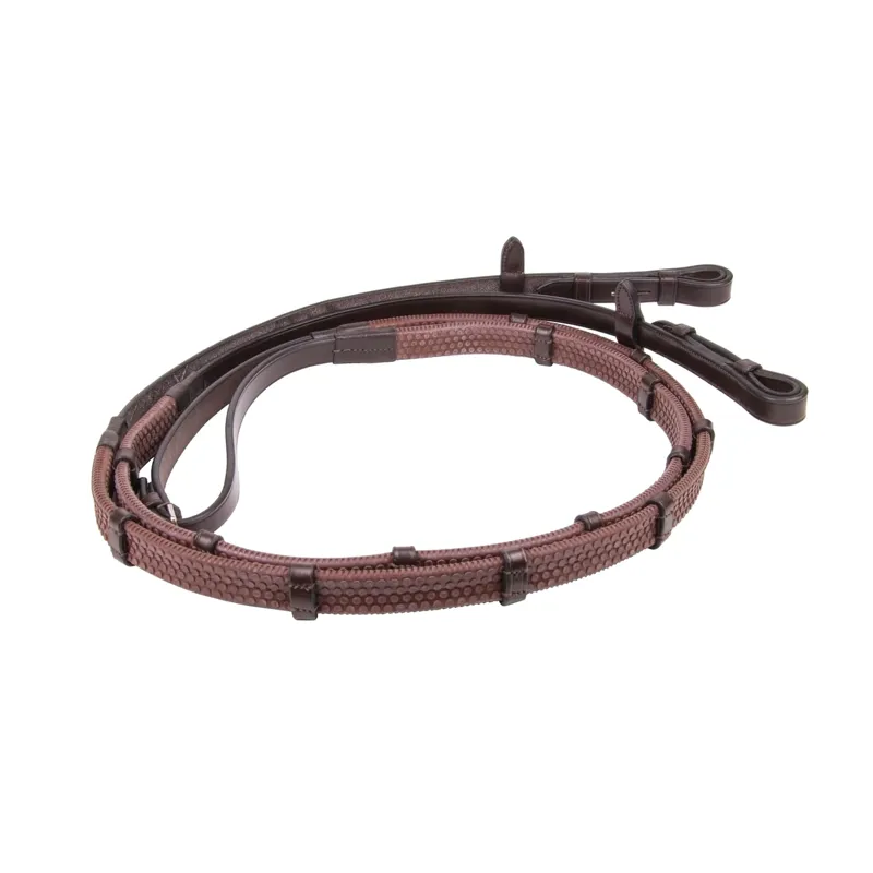 Continental design reins with rubber grip and leather markers. Rein length 59.5″.