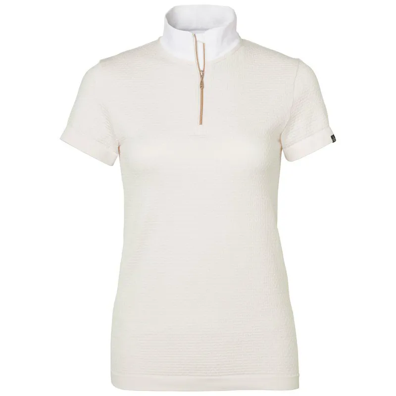 Feminine seamless competition tech top with a white collar suitable for competition.