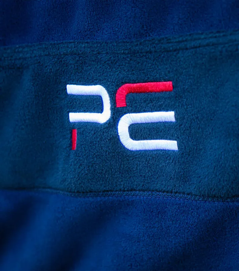 Manufactured exclusively in navy featuring traditional colours and style lines, making it the ideal fleece for team or individual embroidery. The rolled neckline is a comfort feature, alleviating pressure from over the wither and preventing a tight restrictive neckline. Visible seam lines are actually shaped panels, cut to contour the body and create the perfect fit, eliminating the need for a centre back seam. A multipurpose horse cooler rug, ideal for travelling, shows or at home for daily use after exercise.