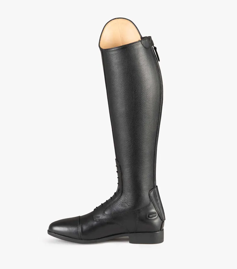 The sleek and elegant design of these tall field boots provide a unique twist on traditional design. Created in a carefully selected European leather outer and with a soft, textured leather applied to the inner calf, these ladies tall riding boots offer comfort and performance at an affordable price. The inside of the boot is lined with an ethically conscious synthetic lining, providing a sculpted and comfortable fit for everyday use.