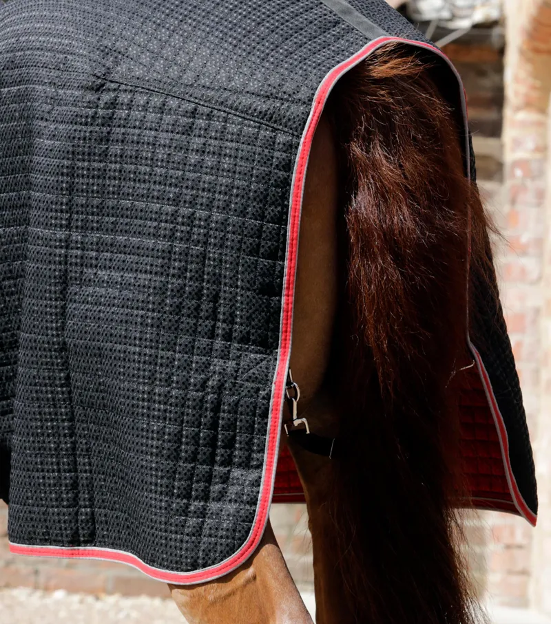 Combining innovation with tradition we have created a refined, top quality cooler that is suitable for a wide variety of uses. Constructed using three layers of technical fabrics this rug is at the forefront of cooling technology. The lining is constructed from a lightweight waffle weave which is highly absorbent, durable and helps quickly wick away moisture from your horse’s coat. The middle layer contains a thermo bonded filling which is light, breathable and offers added protection from chills it also helps to draw and disperse moisture speeding up drying time. Our specially designed, quilted waffle weave outer provides a traditional, cosy aesthetic and helps prevent shavings from sticking to the surface of the rug when your horse is stabled.