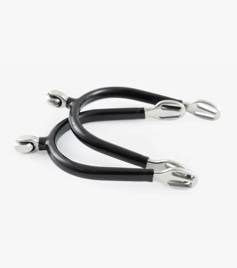 These spurs are rubber covered for a secure contact with the ankle. The free-rolling steel roller balls at the rear can help provide gentle encouragement. 22mm neck. Sold in pairs.