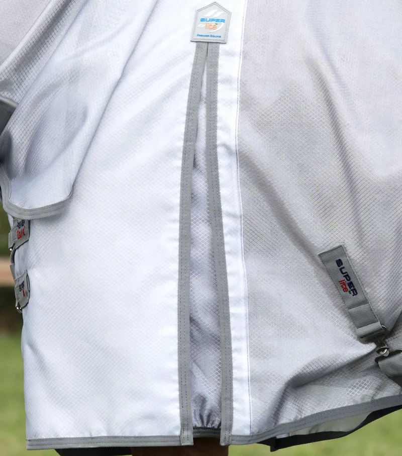 The Super Lite Fly Rug is crafted from a revolutionary super lightweight material developed for protection against the sun, heat build-up & flies. Made from 100% lightweight nylon it offers incredible strength, durability and superior comfort for the horse. In the hottest climates it not only offers protection against insects, but helps to reflect the sun and keep your horse cooler than traditional fly rugs. This super lite fly rug is Approx. 70% UV reflective. Perfect protection for warmer weather or horses who struggle to stay cool during the summer months.