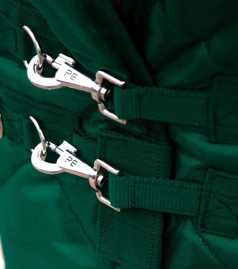 A high quality stable rug thatprovides excellent protection has been crafted in a breathable 420D ripstop polyester which acts as a barrier to your horse’s coat to repel dust, dirt and stains. The 200g technical thermo bonded fill helps to regulate your horse’s temperature, delivering comfort, protection and warmth when needed. The quilting of the fabric layers gives this rug a cosy aestheticand the anti-static polyester lining helps to prevent rubbing and is comfortable against your horse’s skin. Complete with quick release chest clips and cross surcingles, this stable rug is a must-have for milder months.