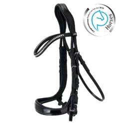 The anatomical double bridle EQUITUS GAMMA is a true innovation by Schockemöhle Sports. Based on the popular EQUITUS line in terms of form andfunction, this model offers maximum wearing comfort for the horse. The curved caveson bypasses the sensitive main facial nerve, more over, additional loops prevent the straps from slipping into the horse’s eyes. The bridle bit is fixed to the noseband with a button rivet, the curb bit is attached to the longer headpiece strap. That way both bits are positioned more stable in the horse’s mouth. Thanks to its extra wide fit the curved browband avoids unnecessary pressure inthe area of eyes and ears. Back pads cover the buckles and protect the horse’shead additionally. EQUITUS GAMMA – the double bridle for a happy and motivated dressage horse!