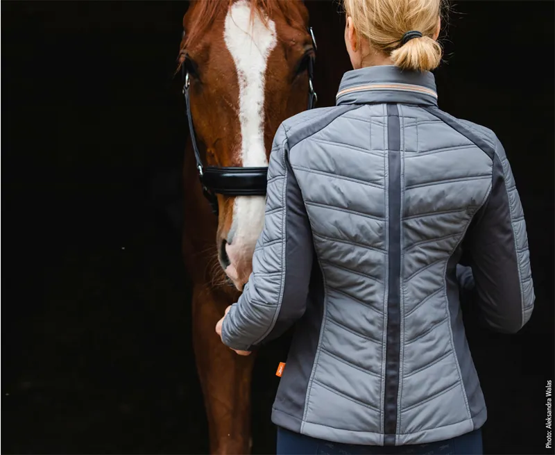 A fashionable material mix makes the ladies’ quilted jacket Samira by Schockemöhle Sports a real eye-catcher. Where as a classical quilted design graces the front, the sleeves and the back are made of softshell and have stylish details in a contrasting colour. Because this waisted model is especially leightweight, waterproof and breathable, but at the same time keeps you warm thanks to Dupont filling and fleece lining, it is also suitable for periods between seasons. A two-way zipper guarantees enough freedom of movement in the saddle.